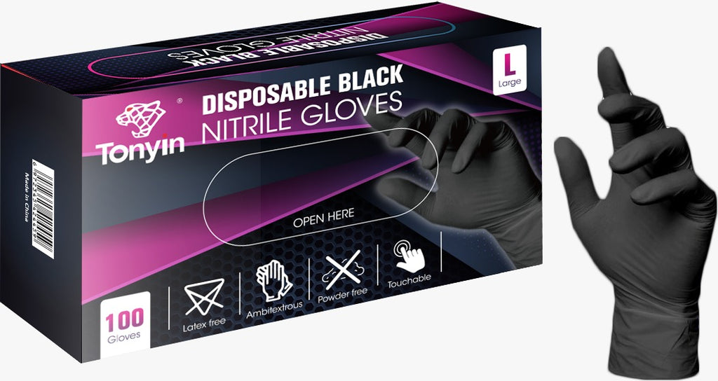 Box of 100, comfortable extra-strong premium quality black nitrile disposable gloves that are 4 mils thick and offer incredible stretch with no tearing or pinching. See our glove sizing chart image to determine your correct glove size.