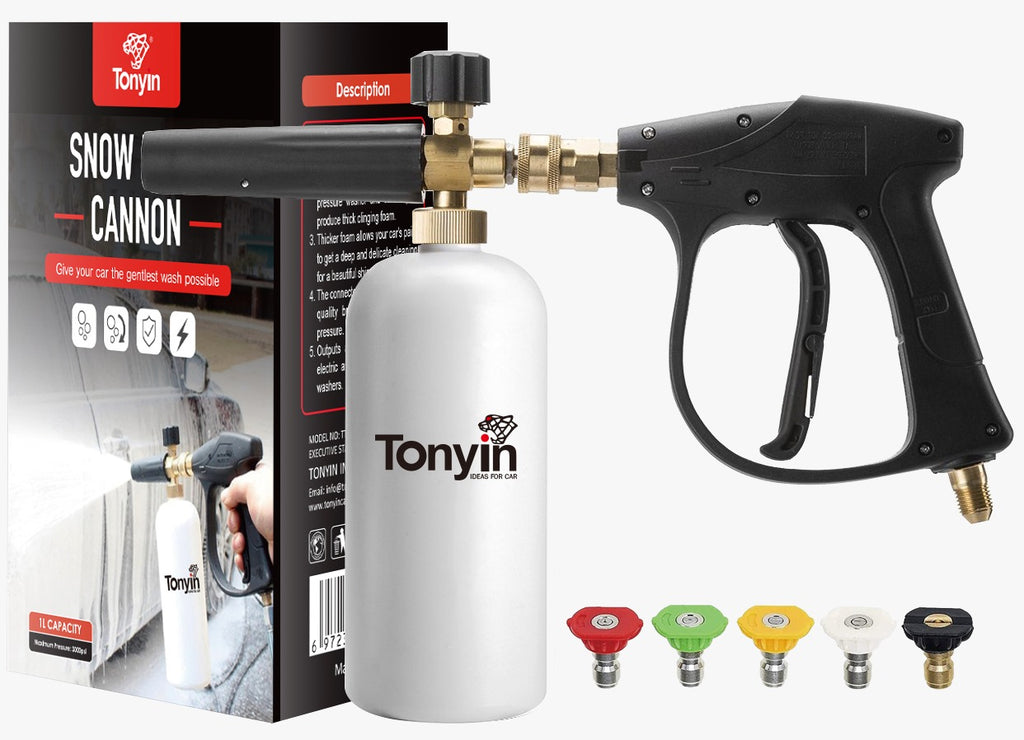 -The Foam Cannon Set Includes: 1x spray gun, 1x 1L capacity spray bottle with an adjustable pressure knob, 1x microfiber wash mitt, 5x different types of nozzles (0°,15°,25°,40°,65°)